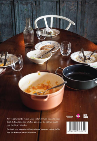 Wat verschijnt er bij Jeroen Meus op tafel? In zijn nieuwste boek deelt de Dagelijkse kost-chef de gerechten die hij thuis maakt voor familie en vrienden. Een boek met meer dan 100 gevarieerde recepten, dat de liefde voor het koken en samen eten viert.