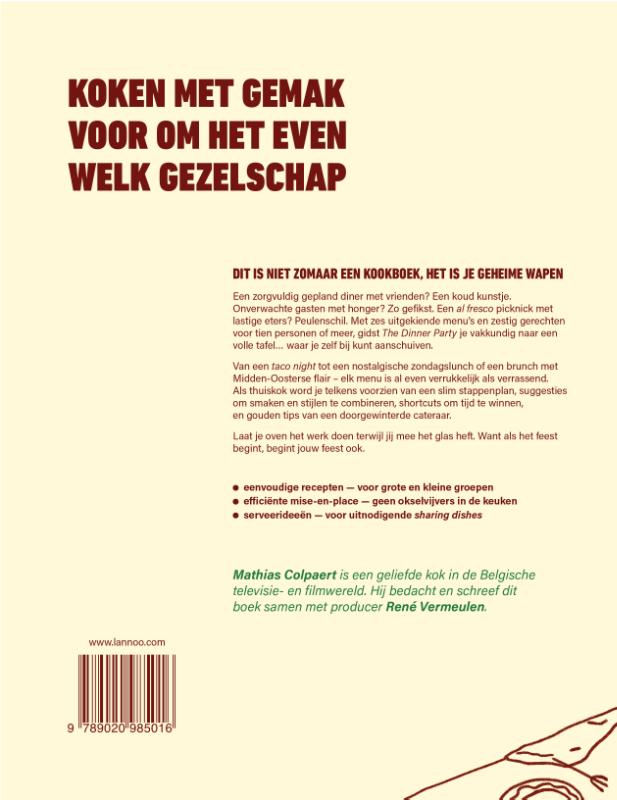 Van een taco night tot een nostalgische zondagslunch of een brunch met Midden-Oosterse flair - elk menu is al even verrukkelijk als verrassend. Als thuiskok word je telkens voorzien van een slim stappenplan, suggesties om smaken en stijlen te combineren, shortcuts om tijd te winnen, en gouden tips van een doorgewinterde cateraar.