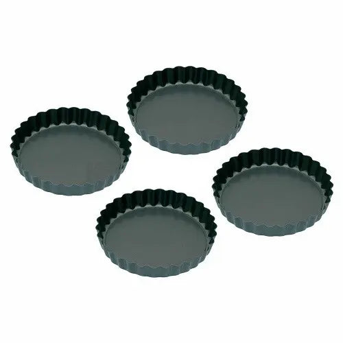 Set van 4 kleine ronde bakvormen, ideaal voor het maken van kleine miniatuur taarten en vlaaien. Elk vormpje heeft geribbelde zijkanten en een losse bodem. Dit zorgt ervoor dat het baksel gemakkelijk te verwijderen is uit de vorm. Ook bevatten deze vormen een anti-aanbaklaag.