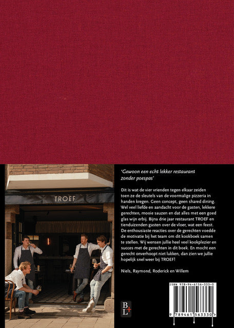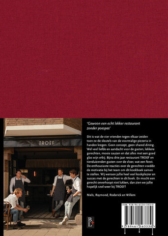 ‘Gewoon een echt lekker restaurant zonder poespas’ Dit is wat de vier vrienden tegen elkaar zeiden toen ze de sleutels van de voormalige pizzeria in handen kregen. Geen concept, geen shared dining. Wel veel liefde en aandacht voor de gasten, lekkere gerechten, mooie sauzen en dat alles met een goed glas wijn erbij. Bijna drie jaar restaurant TROEF en tienduizenden gasten over de vloer, wat een feest. De enthousiaste reacties over de gerechten voedde de motivatie bij het team om dit kookboek samen te stellen. Wij wensen jullie heel veel kookplezier en succes met de gerechten in dit boek. En mocht een gerecht onverhoopt niet lukken, dan zien we jullie hopelijk snel weer bij TROEF! Niels, Raymond, Roderick en Willem