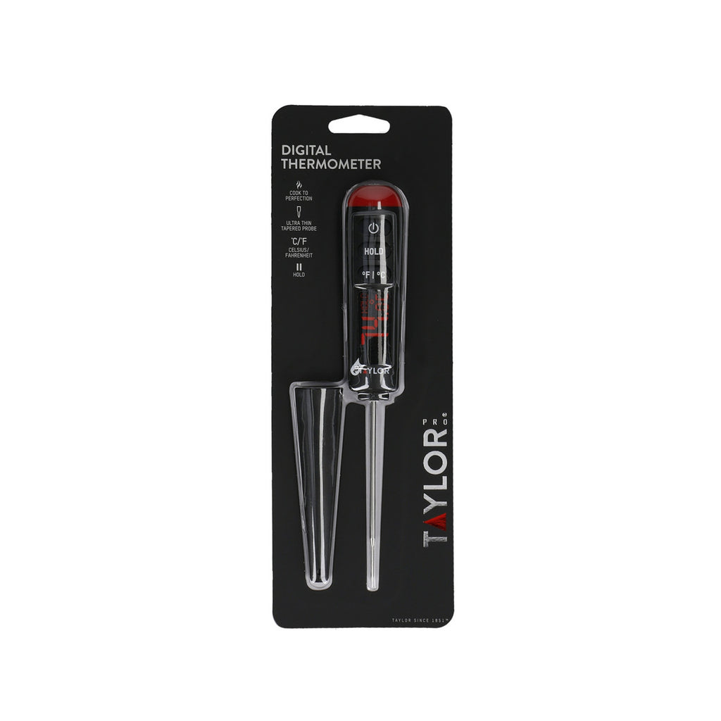 De digitale Taylor Pro-voedselthermometersonde helpt je ervoor te zorgen dat je eten veilig wordt bereid en precies zoals jij het lekker vindt. De nauwkeurige aflezingengeven aan of je vlees, vis of gevogelte klaar is om geserveerd te worden of langer nodig heeft. Hij heeft een heldere rode LED, zodat je de temperatuur al bij de geringste blik kunt aflezen. Er is zelfs een hold-functie: druk op de knop en het apparaat bevriest de meting op het scherm, zelfs nadat de sonde van het voedsel is verwijderd.